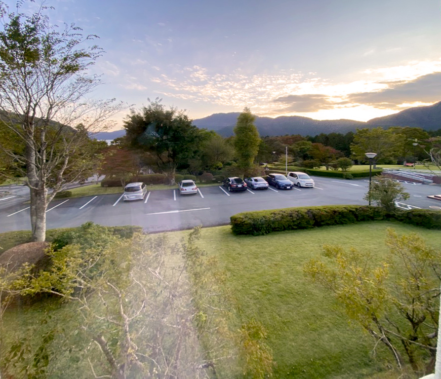 そんな客室の外は既に夕刻で、日は既に箱根の山々の向こう側に落ちてしまっていますが、写真左側中央部、車であればホテルからほぼ目と鼻の先と言った距離のところには、かすかに芦ノ湖が見えています。