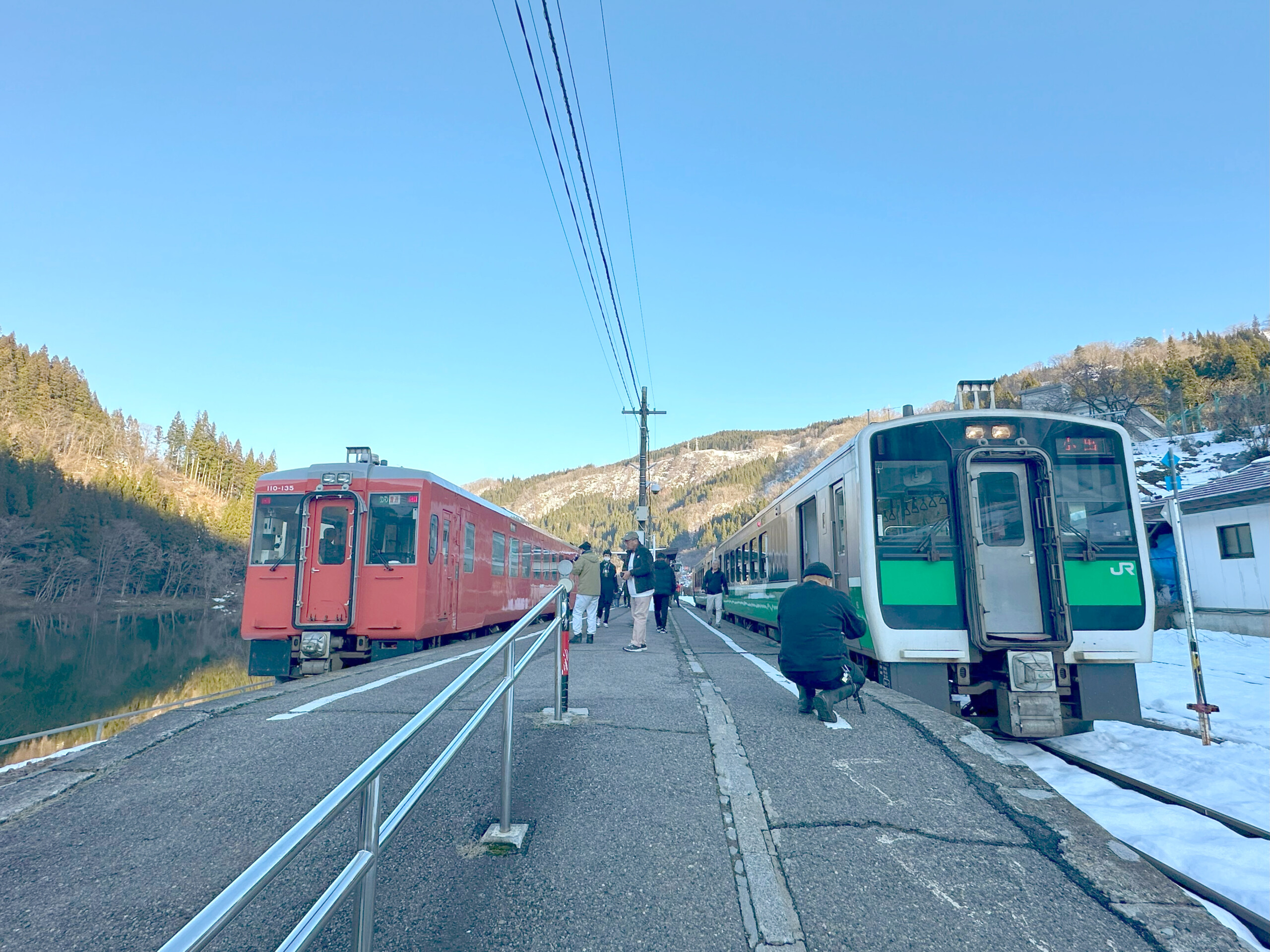 向かって右側に停車している緑色の電車は、2022年10月より只見線に導入されたキハE120形ディーゼルカー、向かって左側に停車している赤い電車は、2023年9月より運用されている、一両編成のキハ110系ディーゼルカーです(リンクは共に、JR東日本公式サイト)。