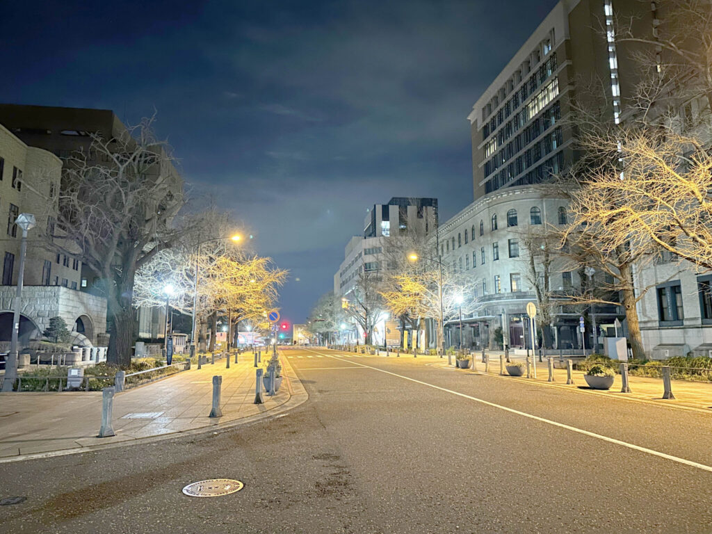 写真左側の車寄せ付き建物は横浜地裁、右側にはKNビル旧・横浜商工奨励館と風格ある建物が建ち並んでいますが、人っこ一人いないコンクリート街は日中とは別世界で、これもまたある種の都会の癒しを感じさせなくもないという「夜の底」を形成しています。