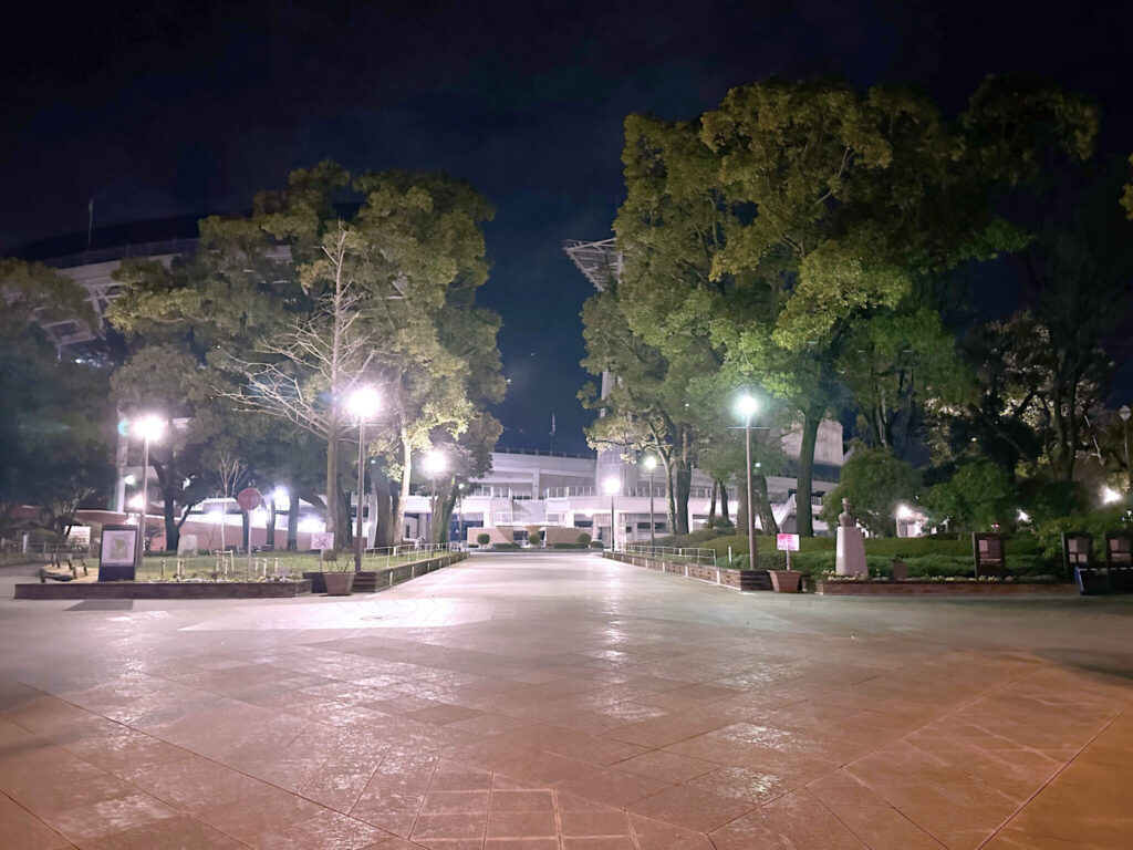 横浜公園に入ると、ベイスターズファンにとっての「聖地」、横浜スタジアムが視界に入ります。
