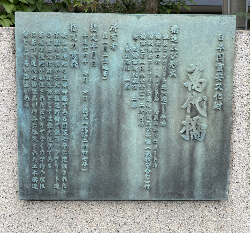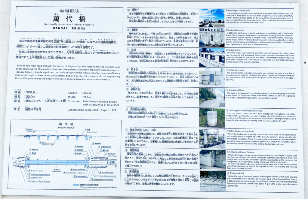 橋の両側には萬代橋についての説明書きが複数置かれていますが、
