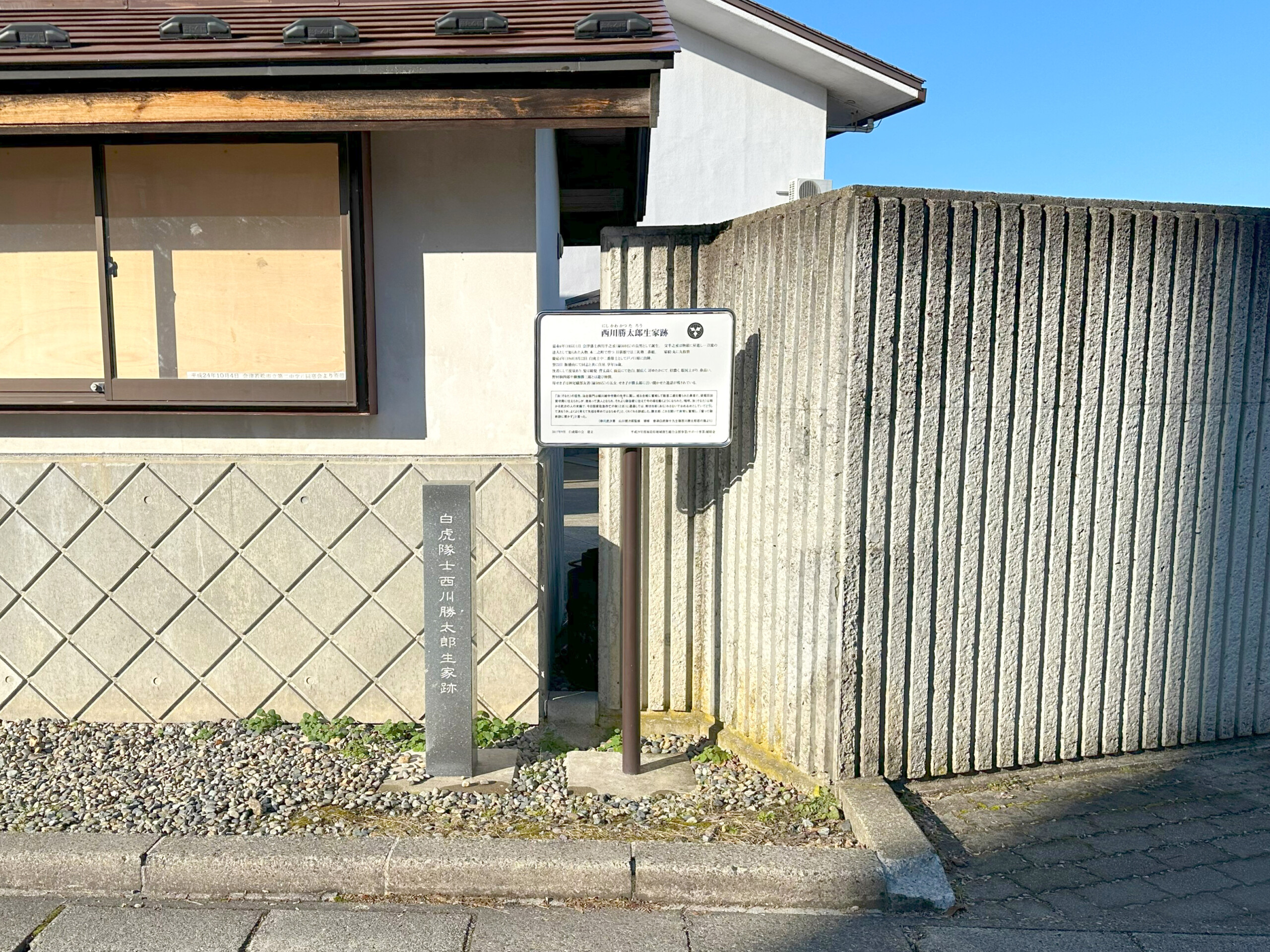 「西川勝太郎(元白虎隊隊士)生家跡」は中学校の校門隣、かつ団地の向かいに位置しています。