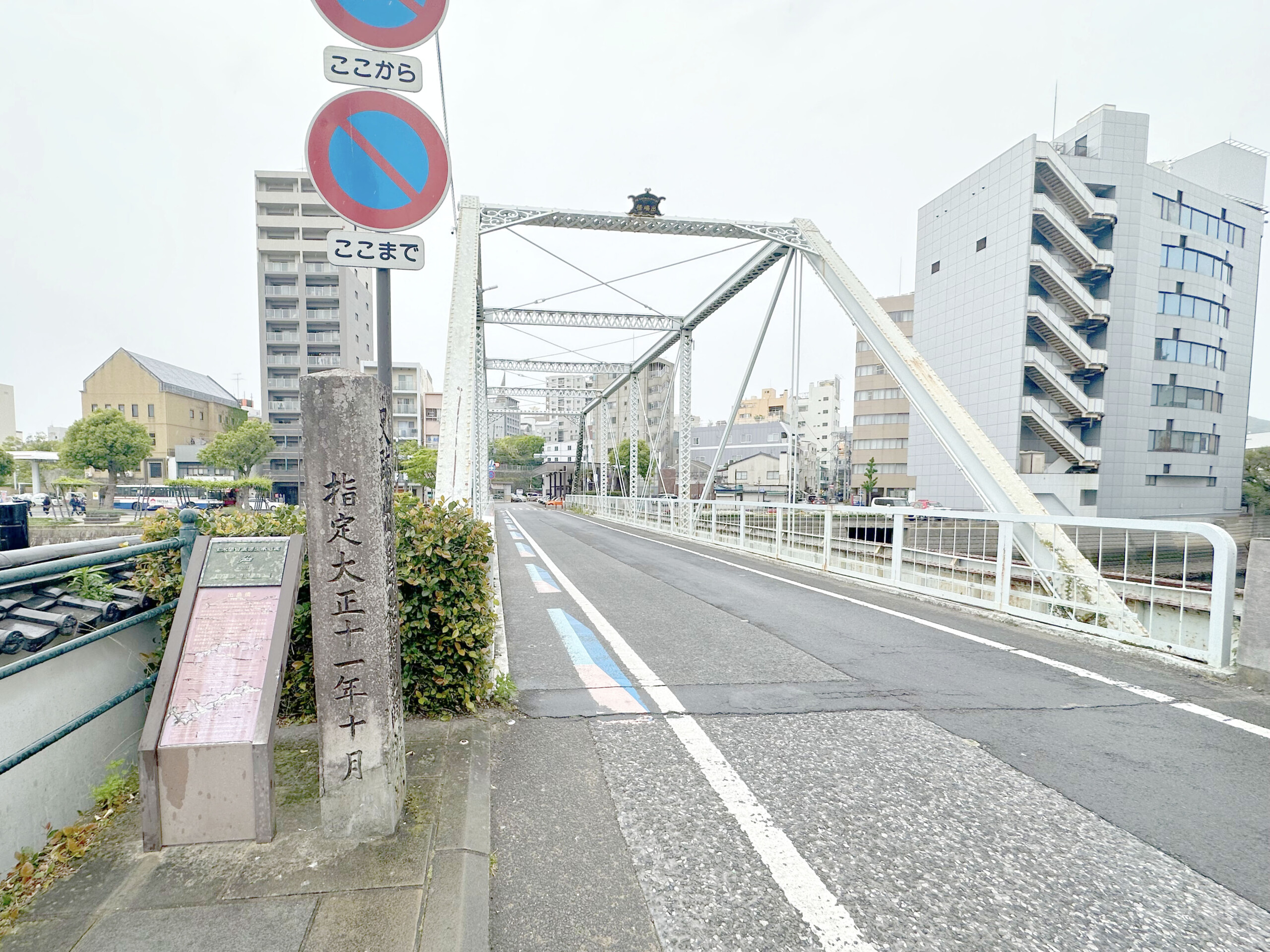 出島橋は、現在一般に利用されている道路橋としては国内最古の橋にあたりますが、出島橋の先で二手に分かれる中島川のうち北側を流れる中島川は、国内最古の石橋である眼鏡橋や、国内最古の鉄橋である銕橋方面に向かって伸びています。