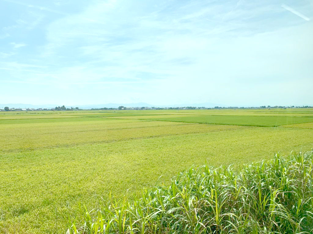 JR新潟駅出発後、内野西が丘駅より先にて、越後線の車窓に田園地帯が広がります。