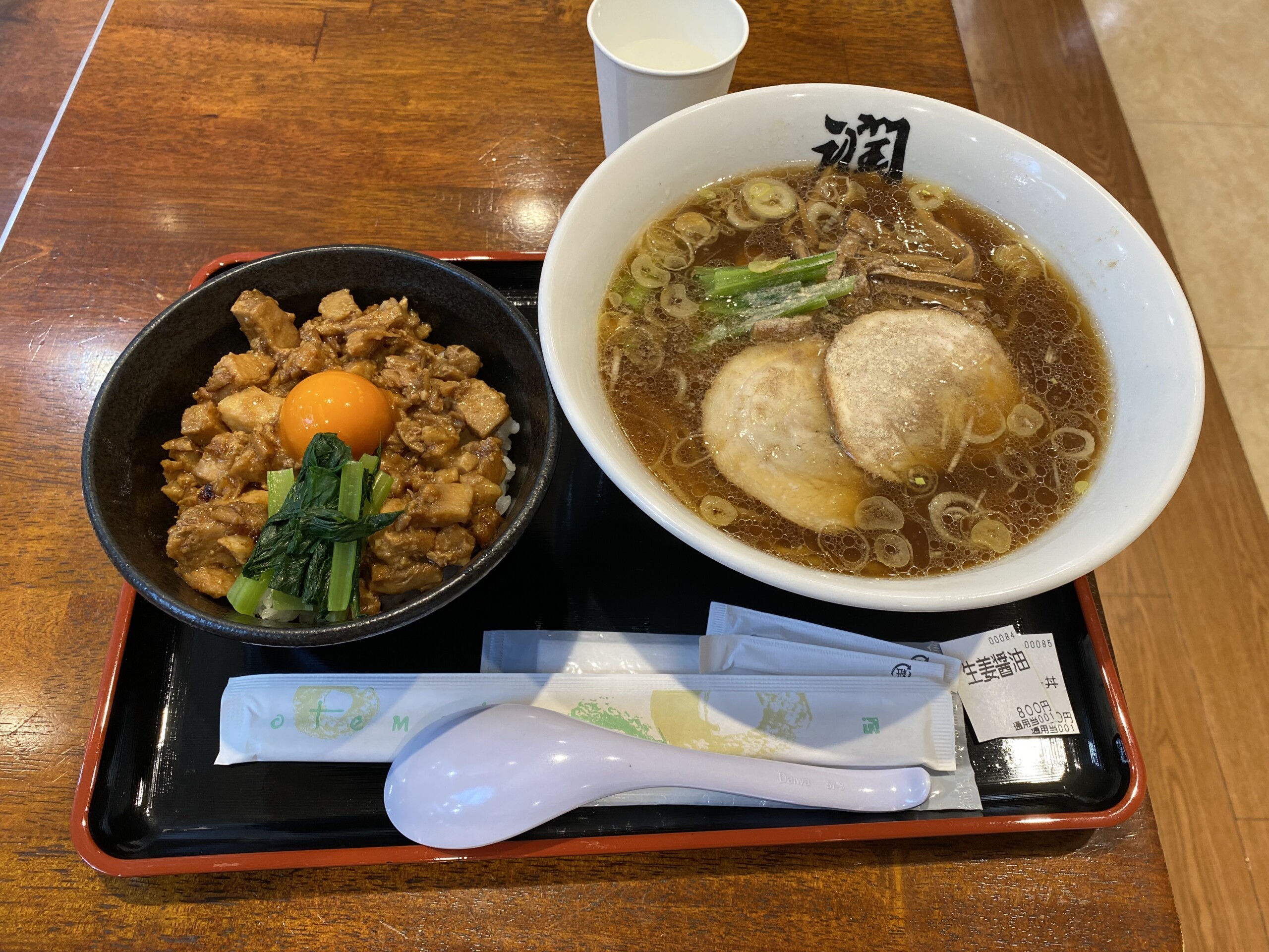 ふるさと村では、この5つの”新潟名物”ラーメンを一つのお店で楽しむことが出来るのですが(注)、今回は、長岡生姜醤油ラーメンにミニチャーシュー丼をセットにしていただきました。