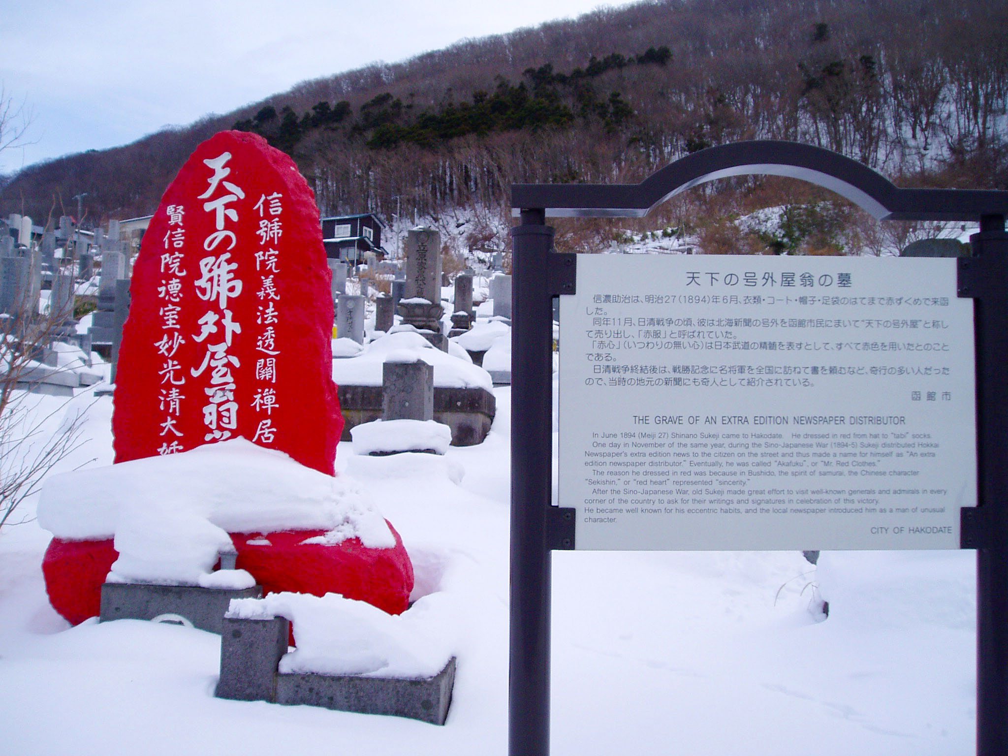 “号外屋”はまた、在りし日には奇行の多い奇人としても有名だったようで、墓石にも生前の生きざまがそのまま体現された赤が用いられているのですが、現在はお墓そのものが(函館市の公式解説付きの)観光スポット化しています(参考:南北海道の文化財 “天下の号外屋翁の墓“)。
