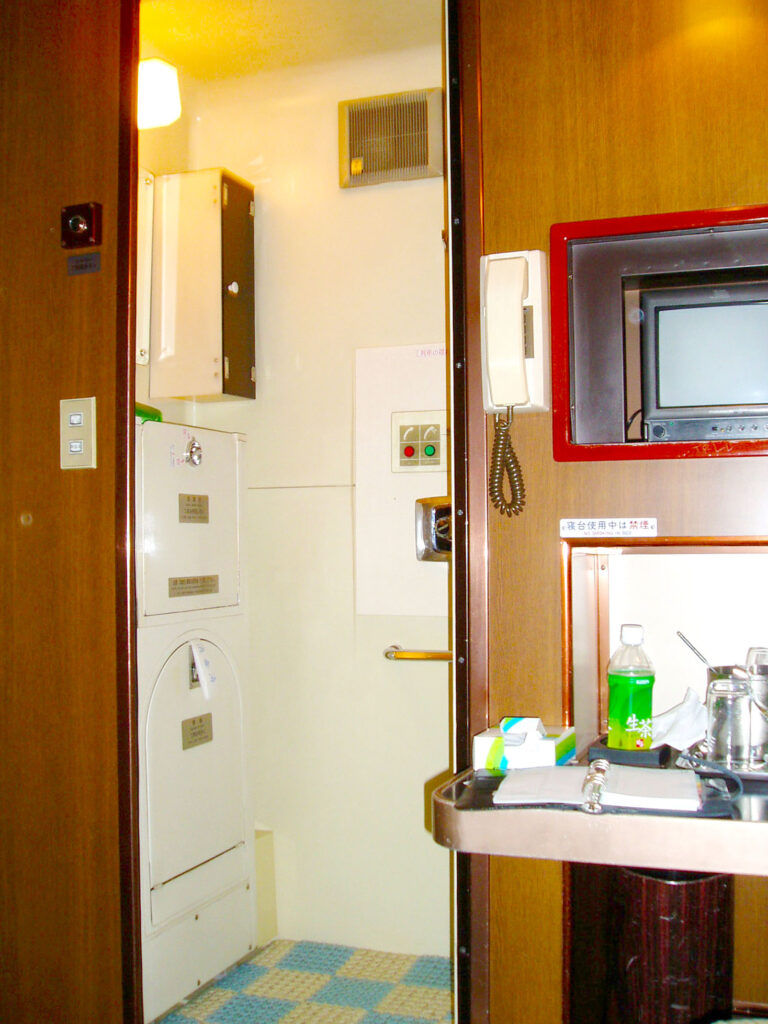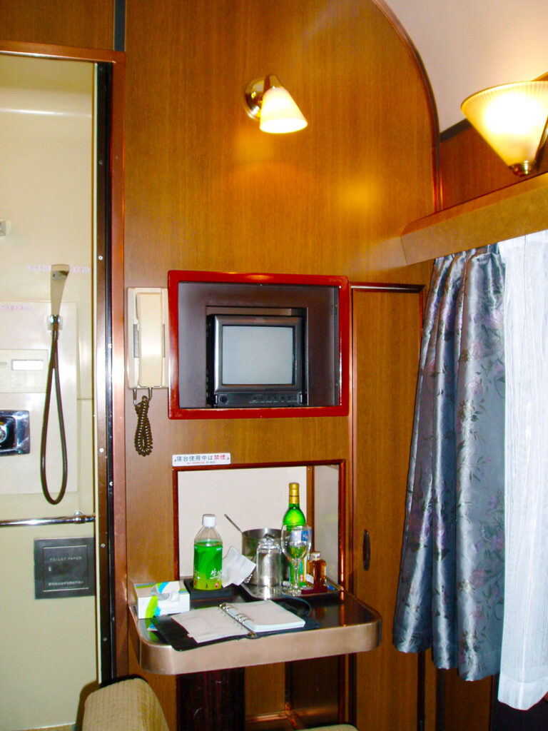 机の左側すぐのところにはシャワー室、机の上部にはディスプレイと内線電話があるという感じで、軽く書き物をする分には問題ない程度のスペースが用意されています。