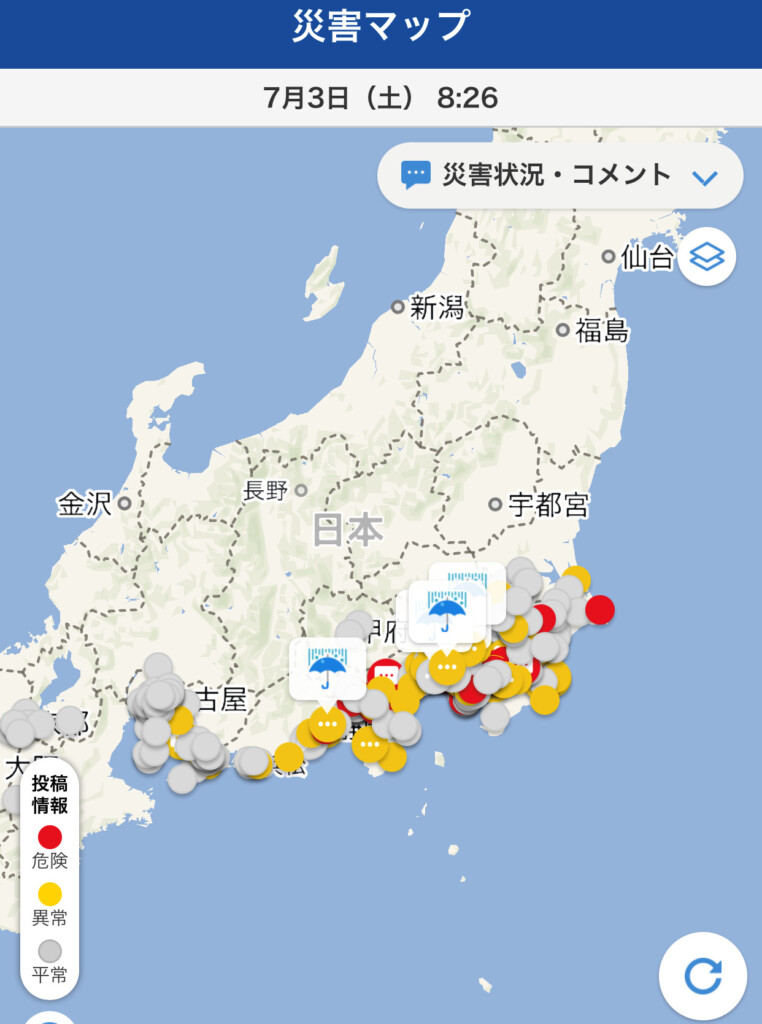 災害状況の投稿にしても雲の動きをそのままなぞらえたような変化となる、すなわち被害が発生する地点が雨雲の列に沿って線状に並んでいく事になるのですが、結論として、この状態の継続が投稿エリア(=降雨エリア)にしばしば深刻な豪雨災害をもたらします。
