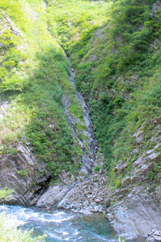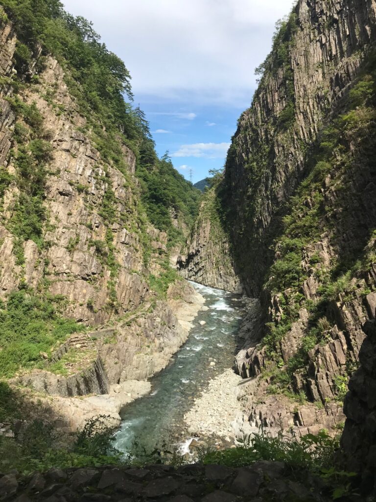 清津峡を作った清津川は、今も絶壁と絶壁の間を縫うように流れています。