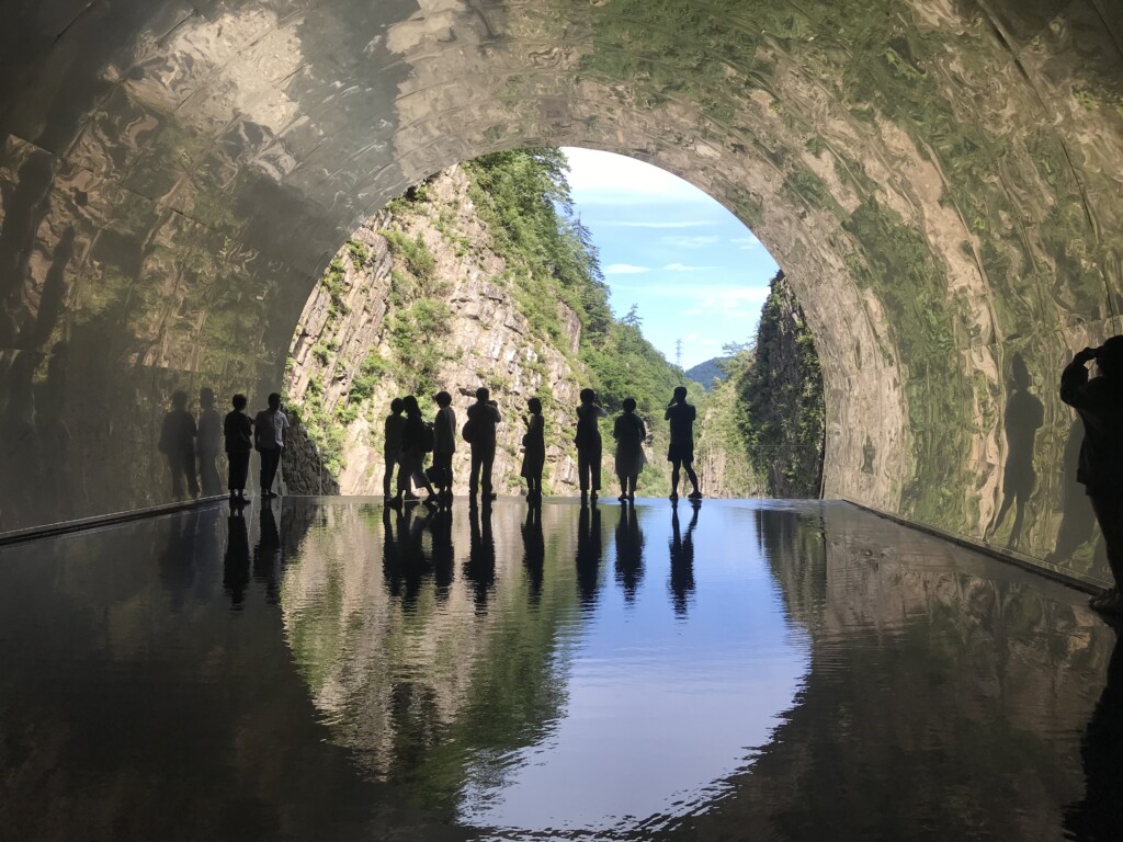 “清津峡”で画像検索をかけるとかなりの高率でヒットするという名物展望台は、中央が水たまり設計になっているので、展望スポットに向かう人の影まで景色の一部となります。
