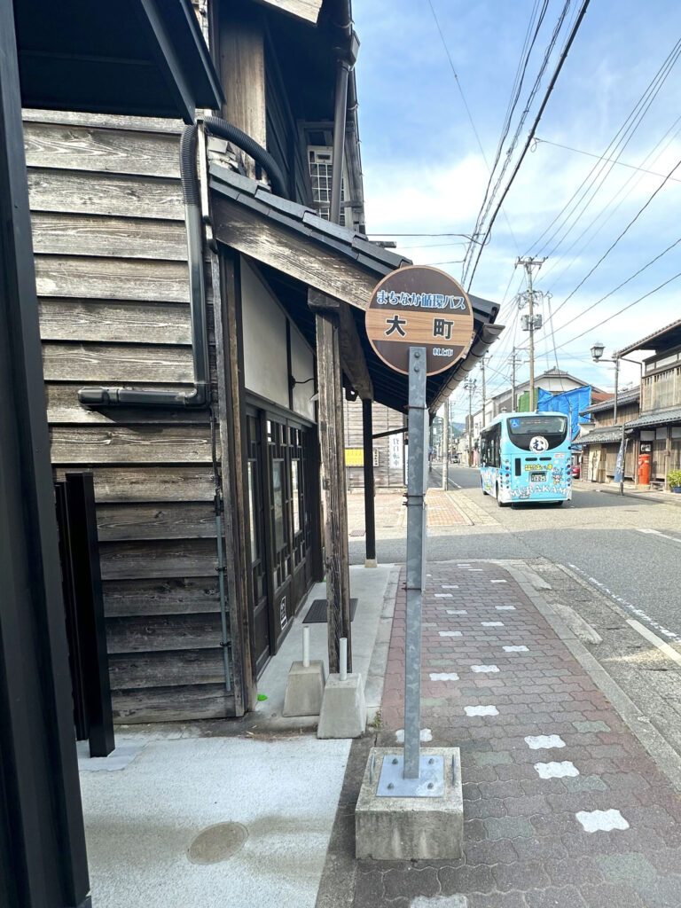 大町バス停の周辺一帯は、大町、小町、上町というように、地域名に”町”が付くエリアの中心部にあたるところで、バス停自体も”町屋通り”と呼ばれる通り沿いに位置しています。