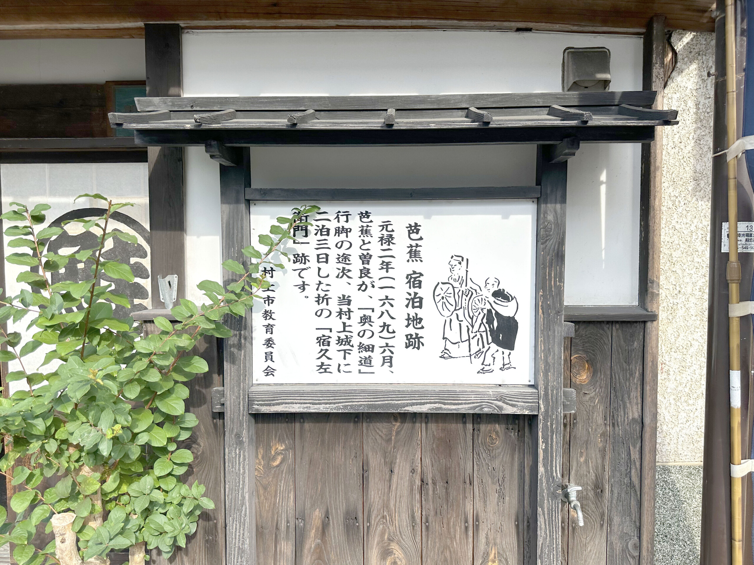 お店の横に周ってみると、松尾芭蕉が奥の細道行脚の際に宿泊した地である旨の表記があって、