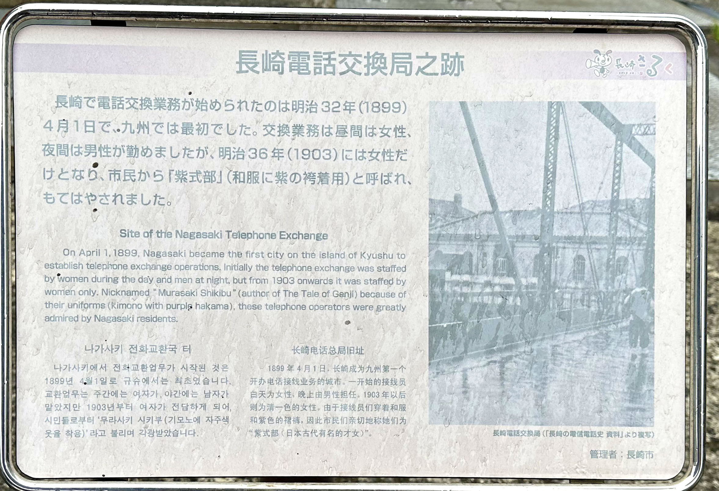 “電話交換業務”一般がそうであったように、やがて明治36年以降、長崎の電話交換局も女性だけの職場となっていきますが、和服に紫の袴をはいて勤務する姿から、長崎にて電話交換業務に従事する女性は”紫式部”と称されたようです。