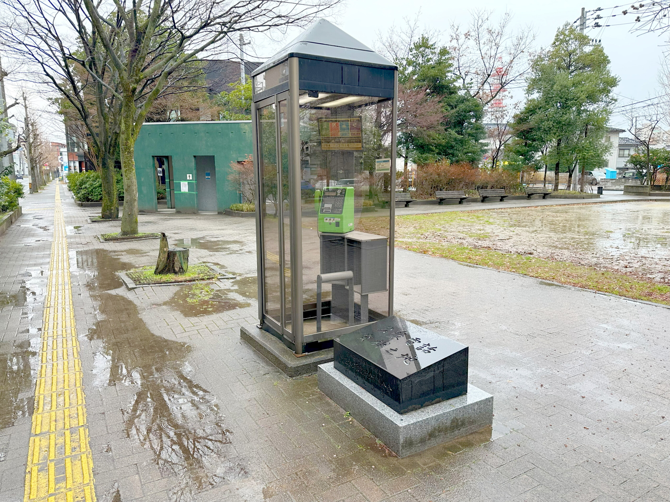 石碑の隣には、今も現役の電話ボックスが置かれています。