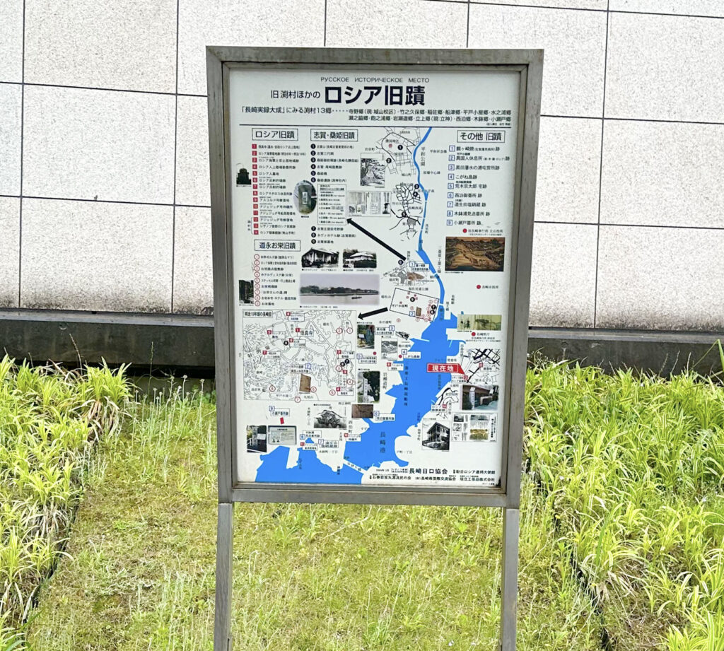 オランダ坂をまっすぐ道なりに下って大浦海岸通りに交差する交差点付近には、かつての事情を偲ばせる碑として、“梅ヶ崎ロシア仮館跡”の案内板が、長崎日ロ協会によって設置されています。