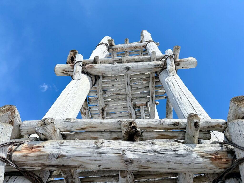 三内丸山遺跡のランドマーク的存在である、遺跡内の北側に位置する大型掘立柱建物は、柱穴の直径、地面に掘られた深さ共に2m、縦方向に三層の構造を持っている(三階建て)という、高さ約20メートルの大型建物です。