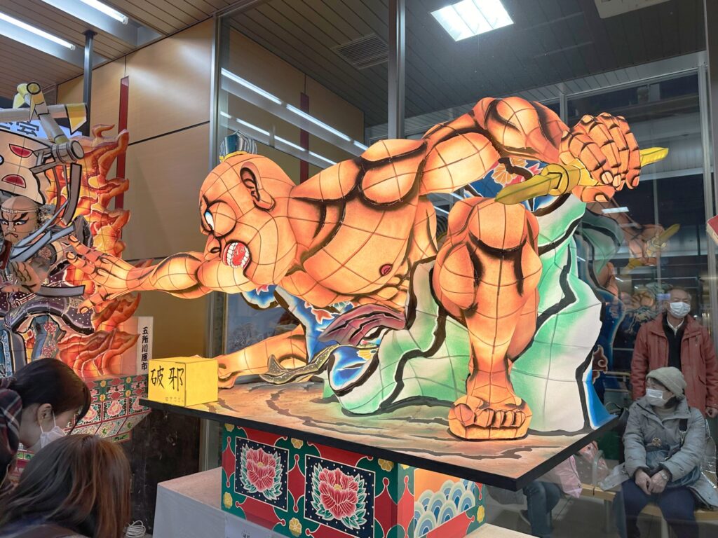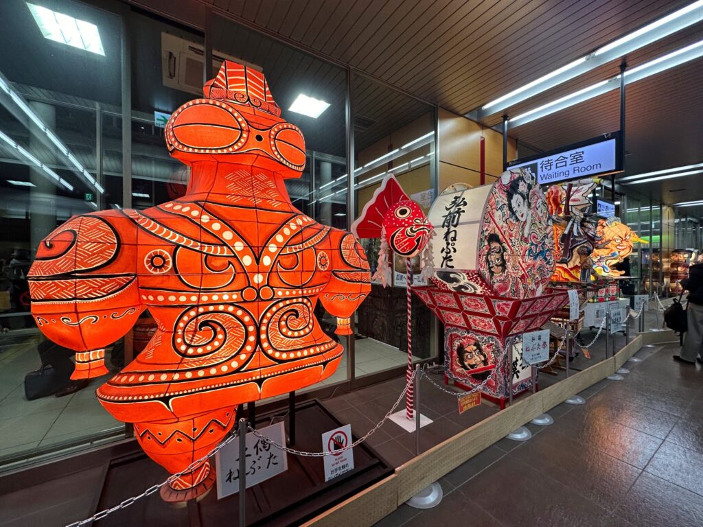 季節までには若干開きがあったのですが、駅構内には青森名物の一つ、ねぶた(”ねぷた”あるいは”ねふた”ともいうようですが、お祭りで使う灯籠のことですね)が展示されていました。