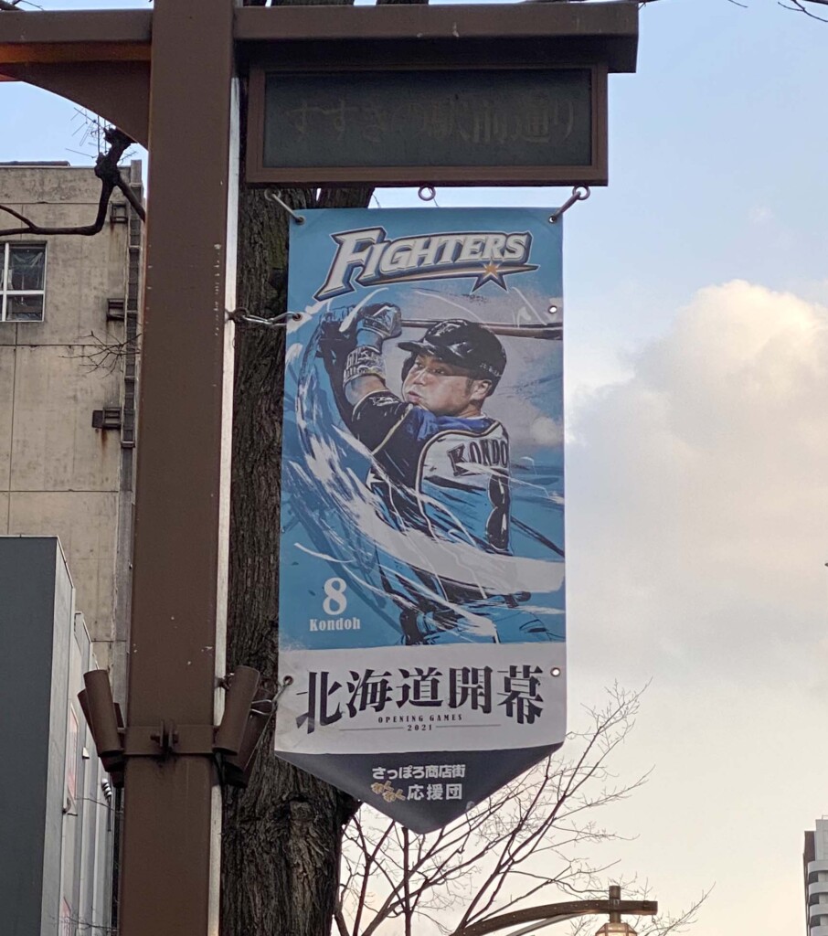 色々な選手のバージョンがあるのですが、すすきのから狸小路の間の一枚には、昨年2020年の打率がリーグ三位の.340だった、横浜高校OB・近藤健介選手のペナントが架けられていました。