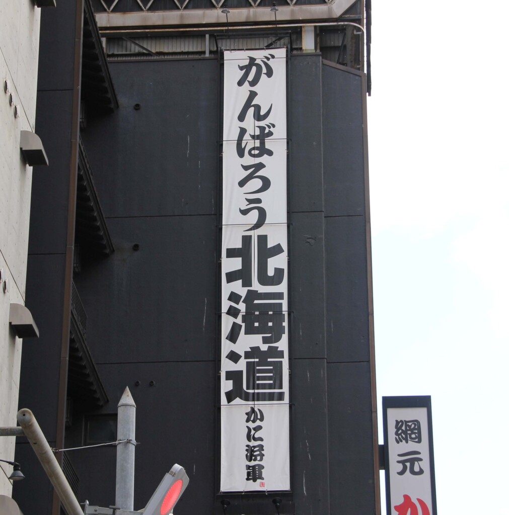 すすきの交差点付近のカニ屋さんに出ていた垂れ幕“がんばろう北海道”です。