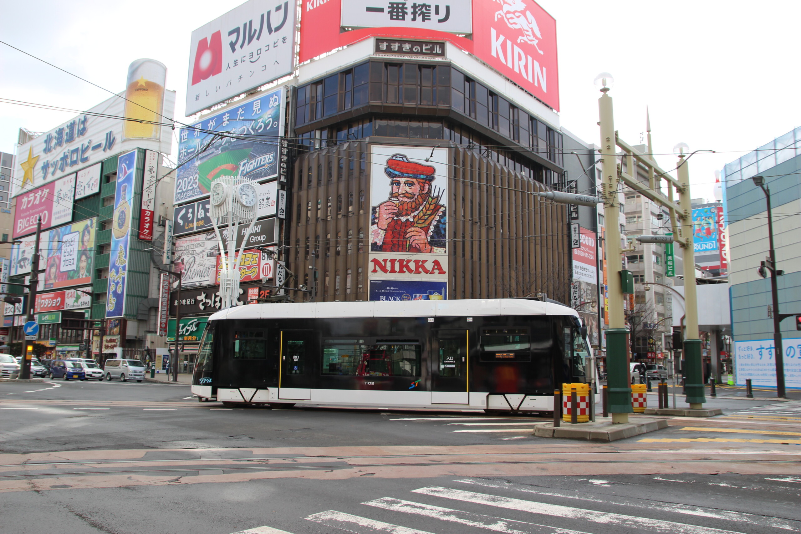 市電のすすきの駅傍、おなじみの看板がある交差点ですが、