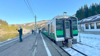 お昼過ぎの只見線(只見線ポータルサイト)に乗車して会津若松駅を出発し、市街地を抜けて只見川との並走区間へ。さらには絶景区間の中の長時間停車駅だった会津川口駅を経て、