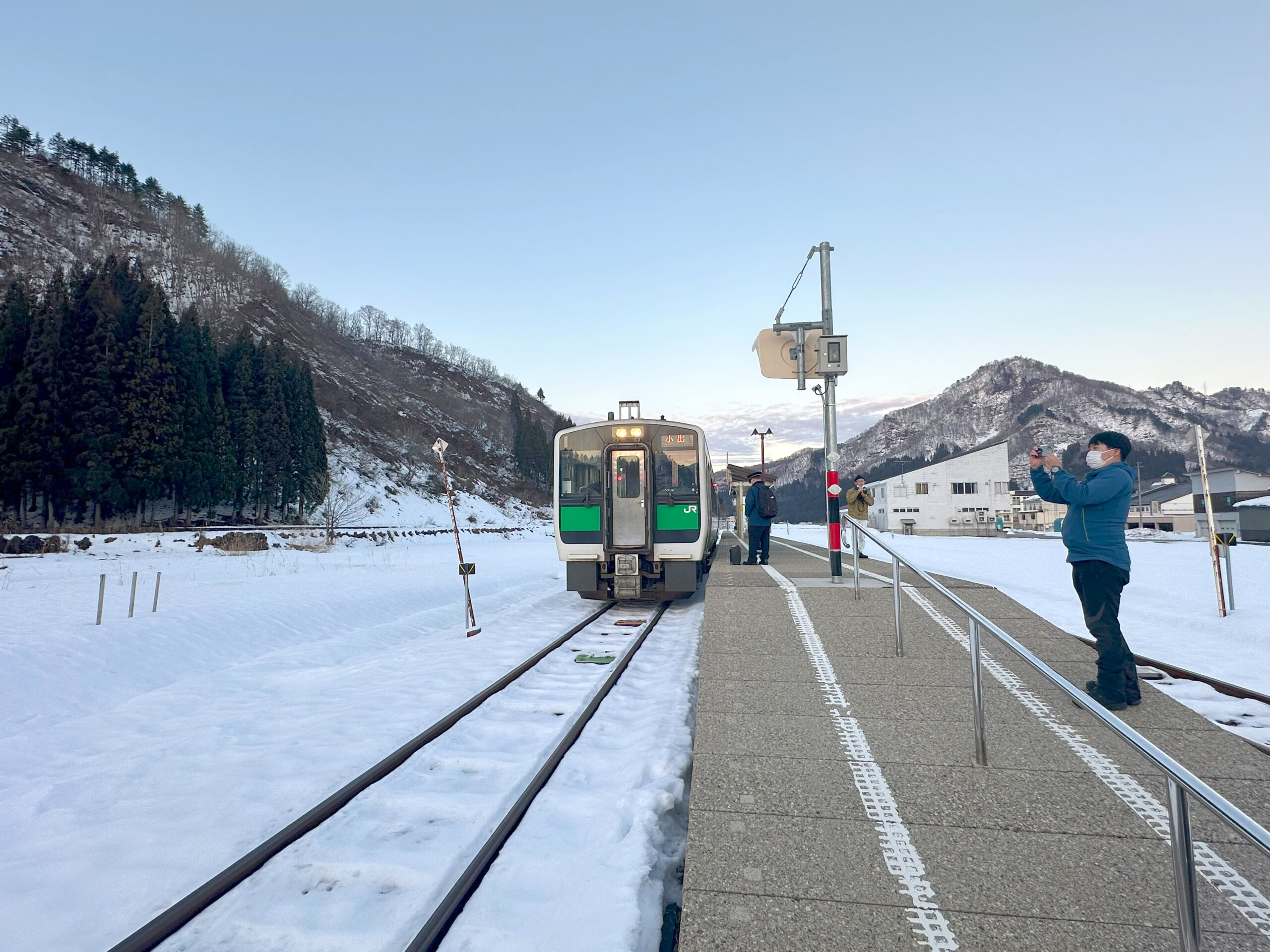 電車は雪景色の中、路線名と同じ名を持つJR只見駅へ到着しました。