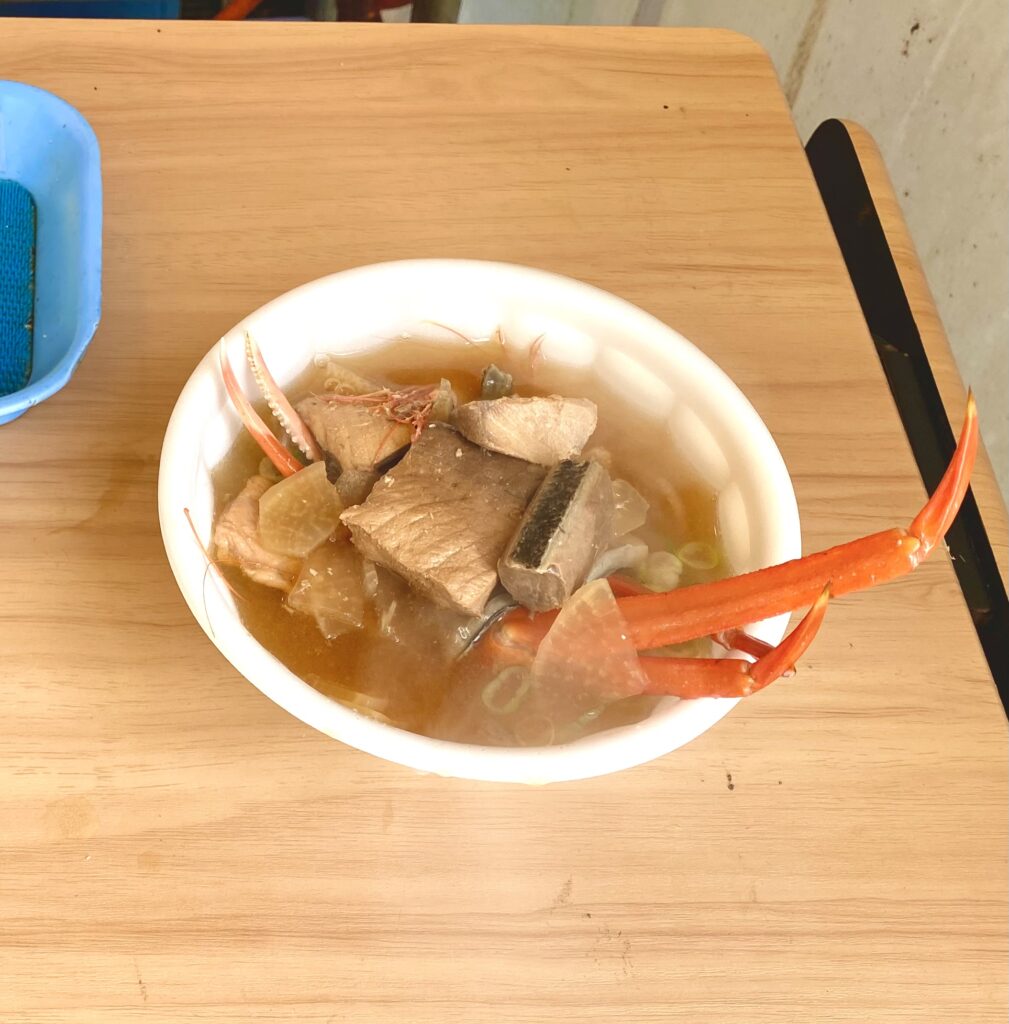 カニの出汁が効いた味噌汁に出汁が染みた薄切りの大根、鮭かサバのような食感の魚とエビの頭も入っていて、上にはネギが散らされていました。