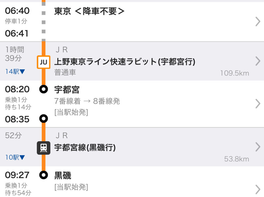 東京駅から先は、同じ電車が“快速ラビット”(JR東日本公式サイト)となって、宇都宮線(ジョルダン “宇都宮線路線図“)区間を快速運転で進みます。