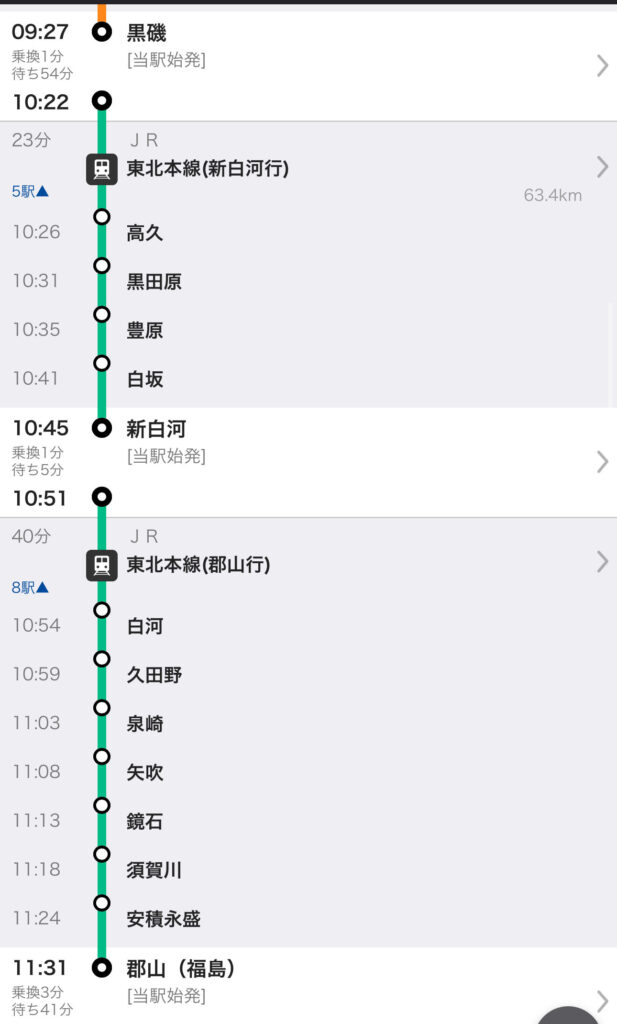 黒磯駅からまずは新白河駅へ、新白河駅からは郡山駅へと、同じ東北本線ではあるのですが、小刻みに乗り継いで進みます。