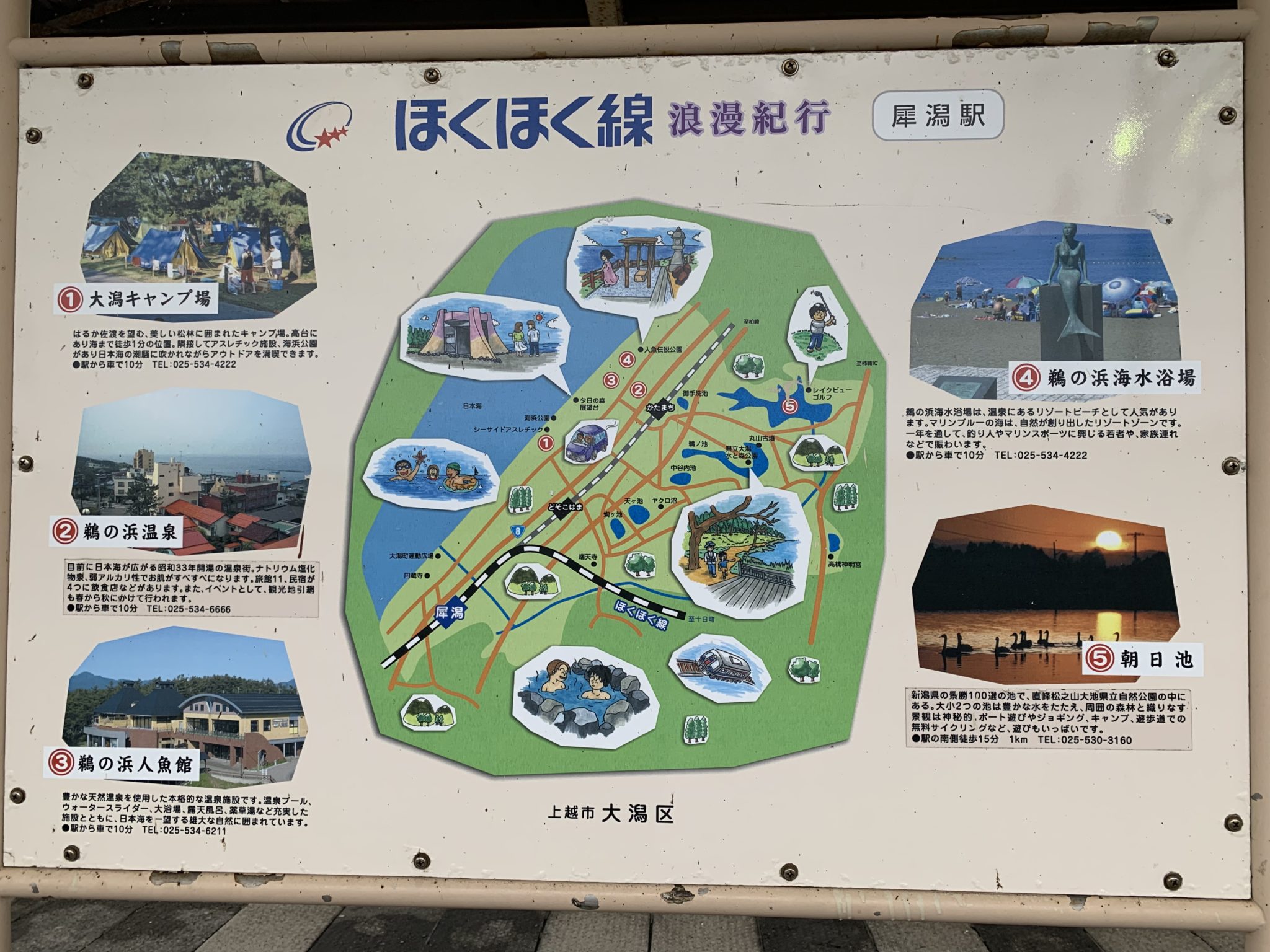 余談として、沿線の観光に力を入れているほくほく線では、日曜日には”トンネルの中を通る度に天井に映像が流れていく”という特別列車・ゆめぞら号が走っているようです。そのことが、車内の広告や駅置きのパンフレットなどでプロモーションされていました。