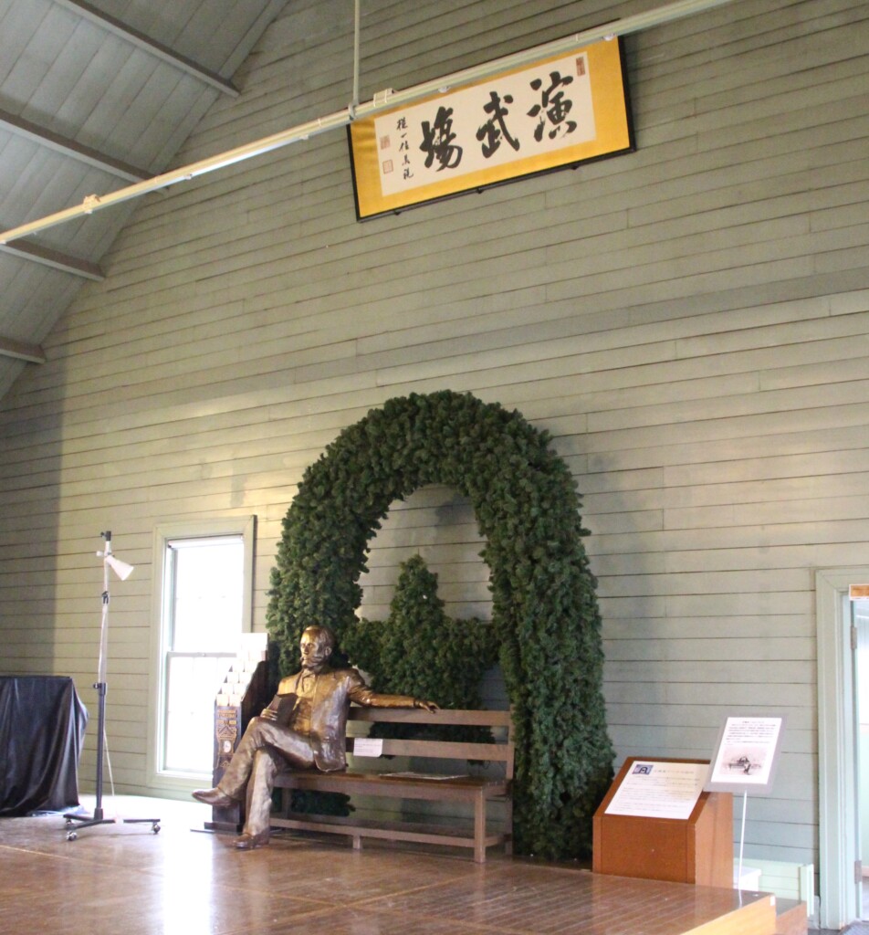 壇上のベンチには、札幌農学校初代教頭ウィリアム・スミス・クラーク博士が座っていて、
