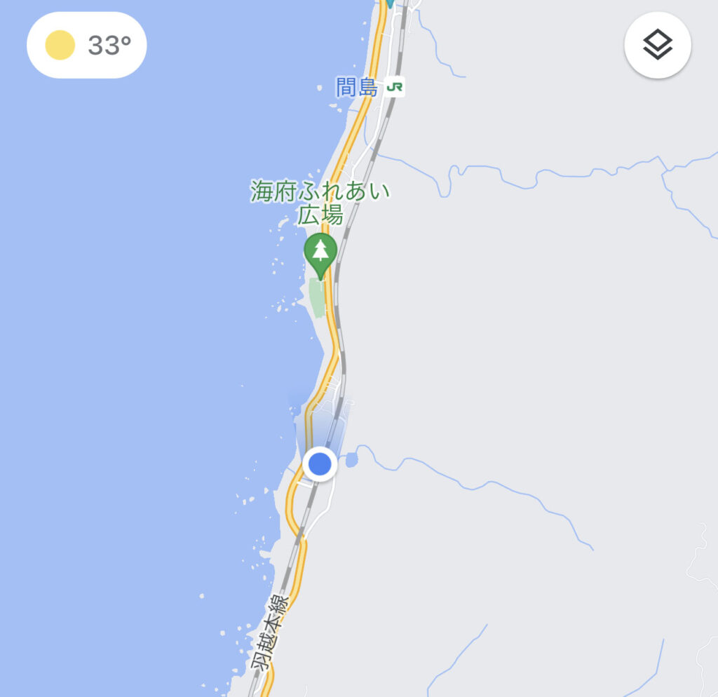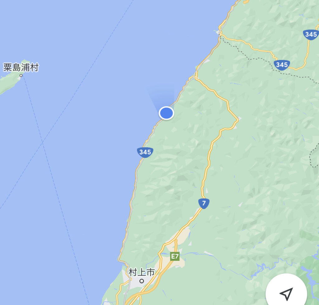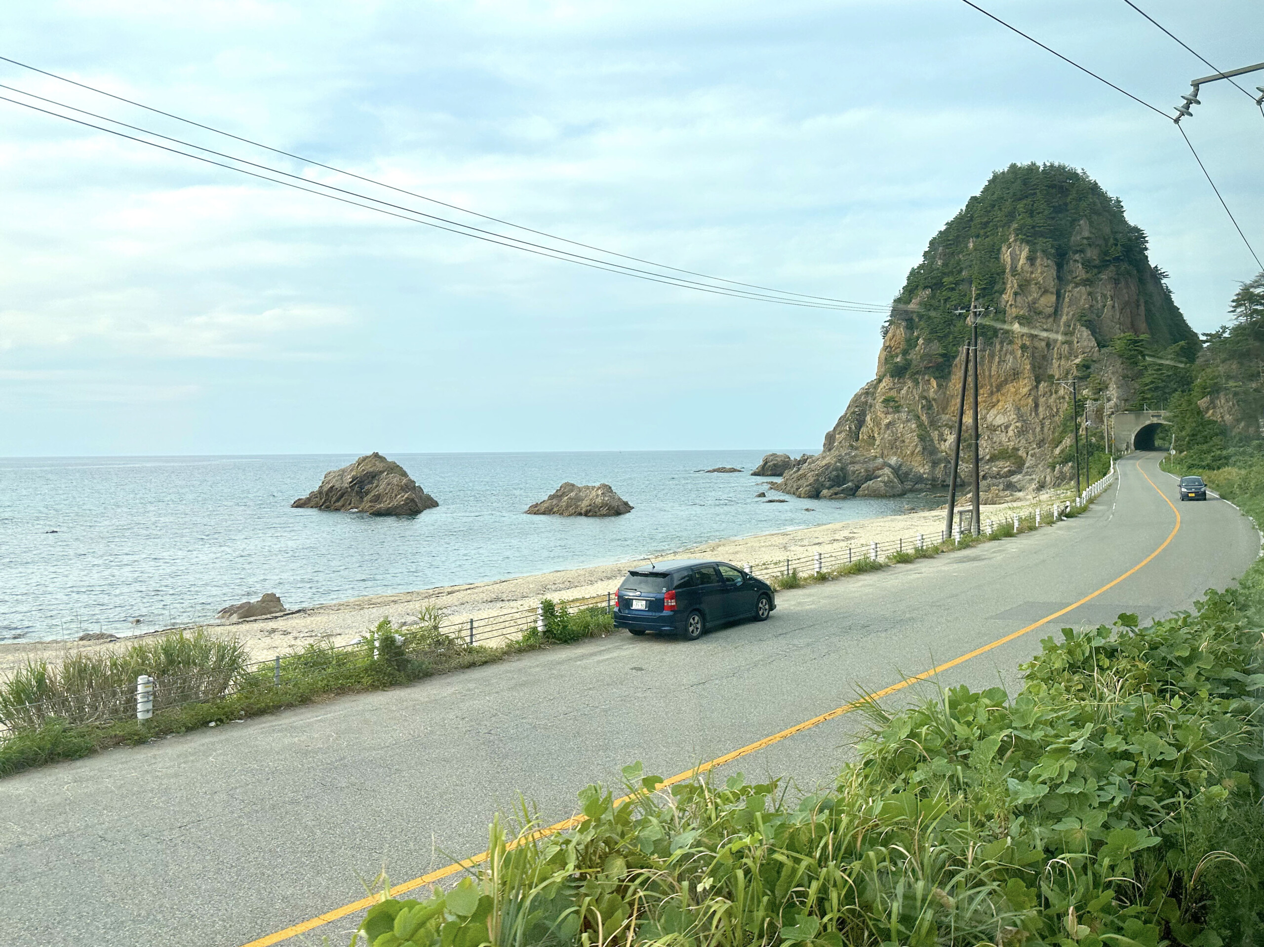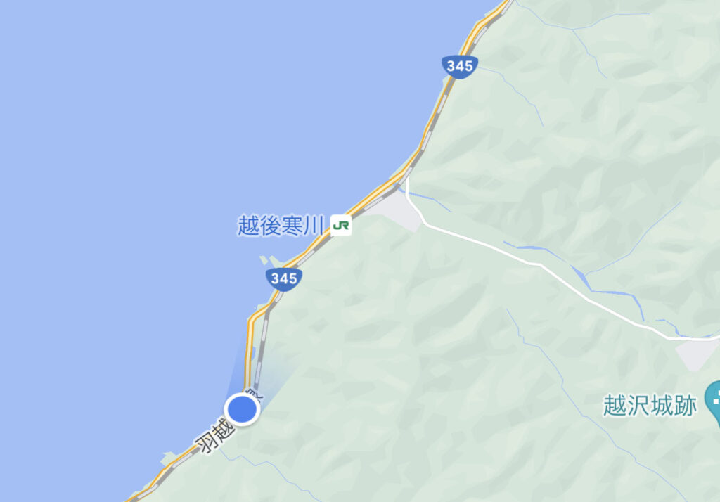 ごつごつした岩場との間には道路が一本通されていますが、これは国道113号線と合流しつつ、新潟市中央区と山形・秋田の県境に位置する山形県の飽海郡遊佐町を結んでいる、国道345号線です。