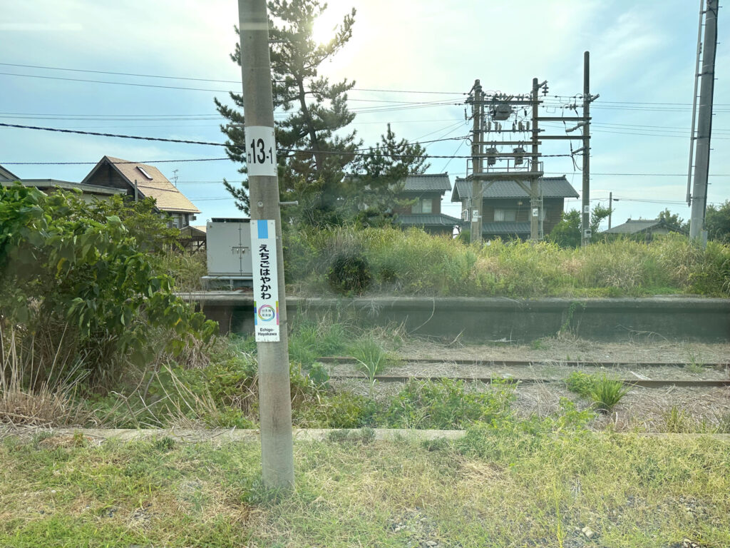 道路と線路の間で、草が生い茂ったような一帯を通過しながら、