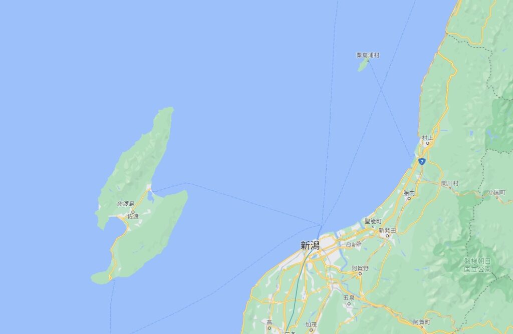 同じく日本海上で南西方向に浮かんでいる佐渡島と比べると、割とその大きさが鮮明になるという、小さな島です。