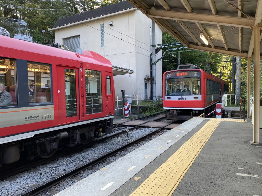 小涌谷駅で新旧2車両がご対面となった形ですが、箱根登山電車は単線区間を持っている上”スイッチバック運転”をしているので、運行上駅での待ち合わせが多い他、駅以外で電車が停車することがあるのも特徴です。