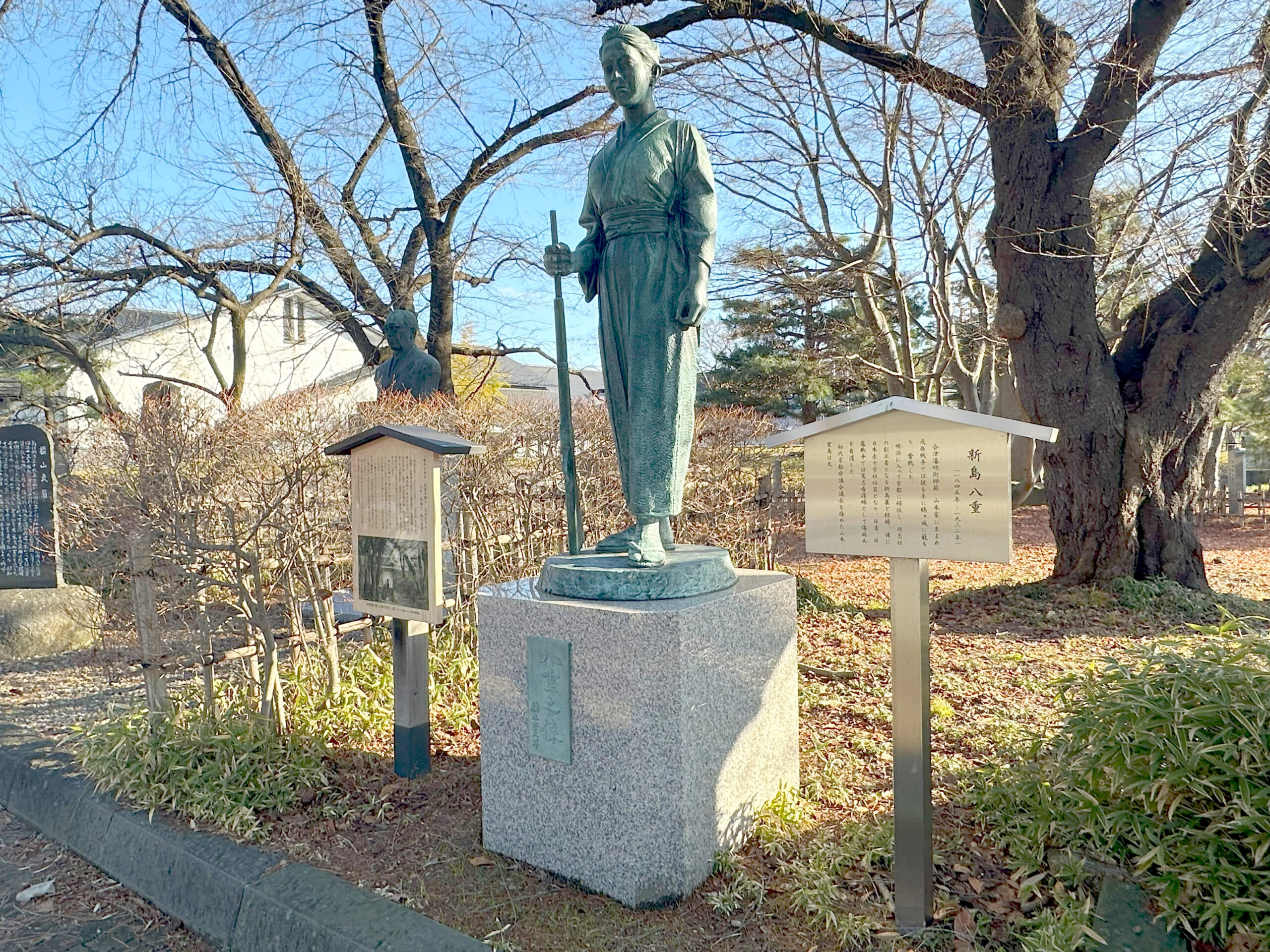 “八重の桜”放映と同年である2013年(平成25年)に建立された像は、鶴ヶ城(公式サイト)の三の丸エリアに位置しています。